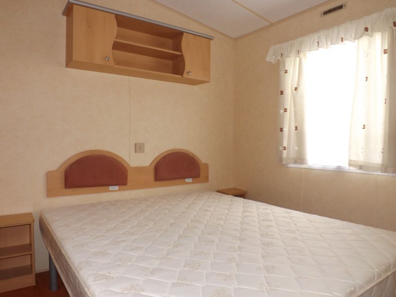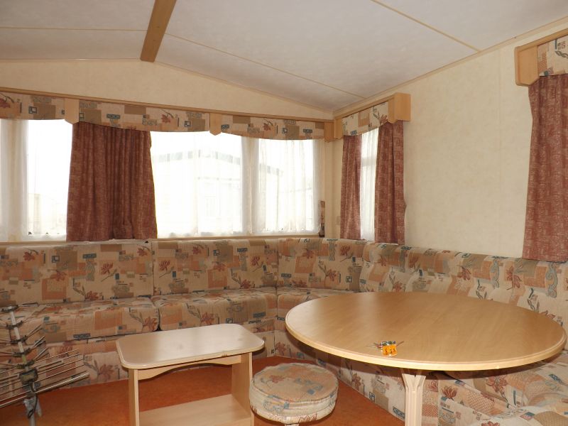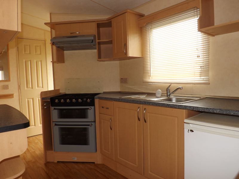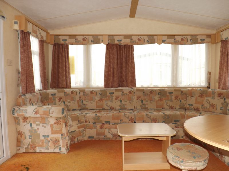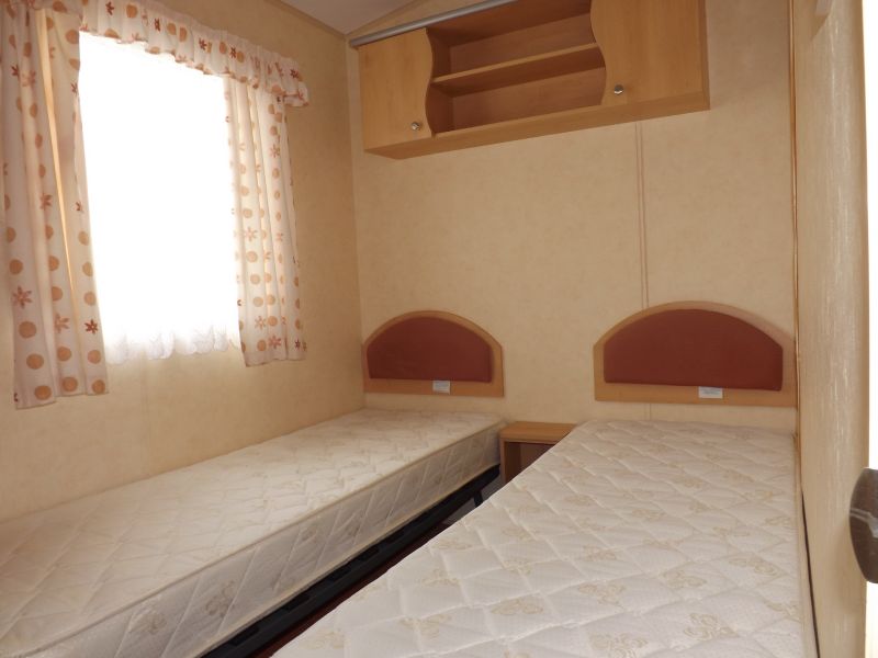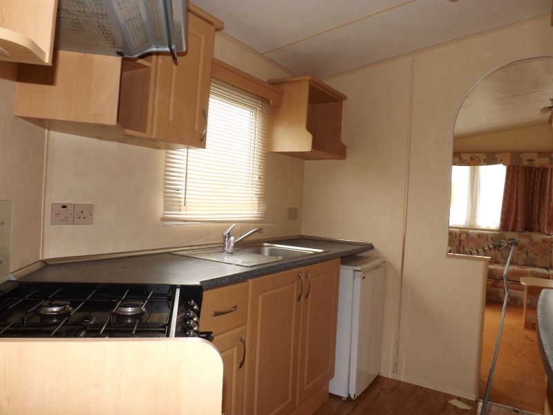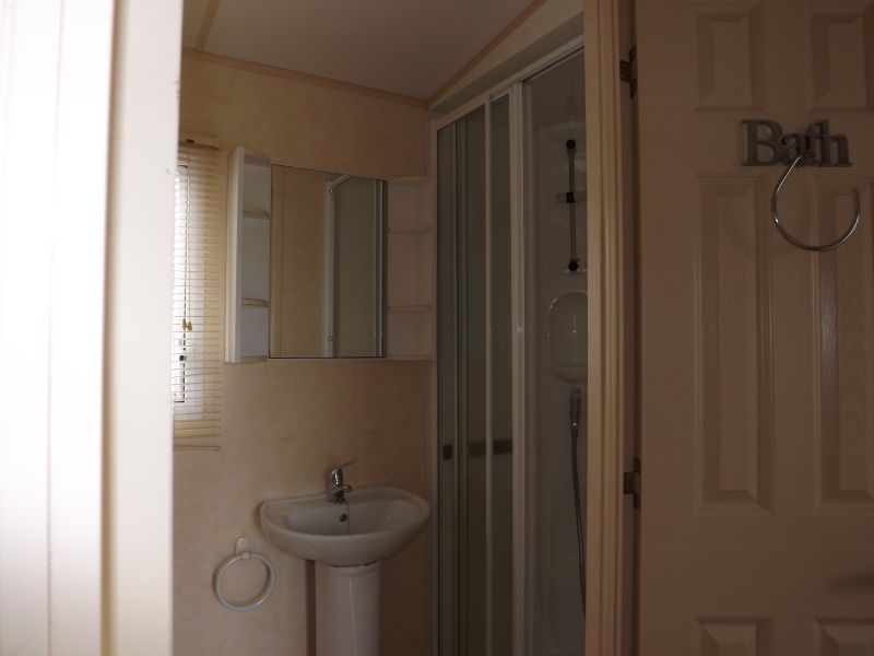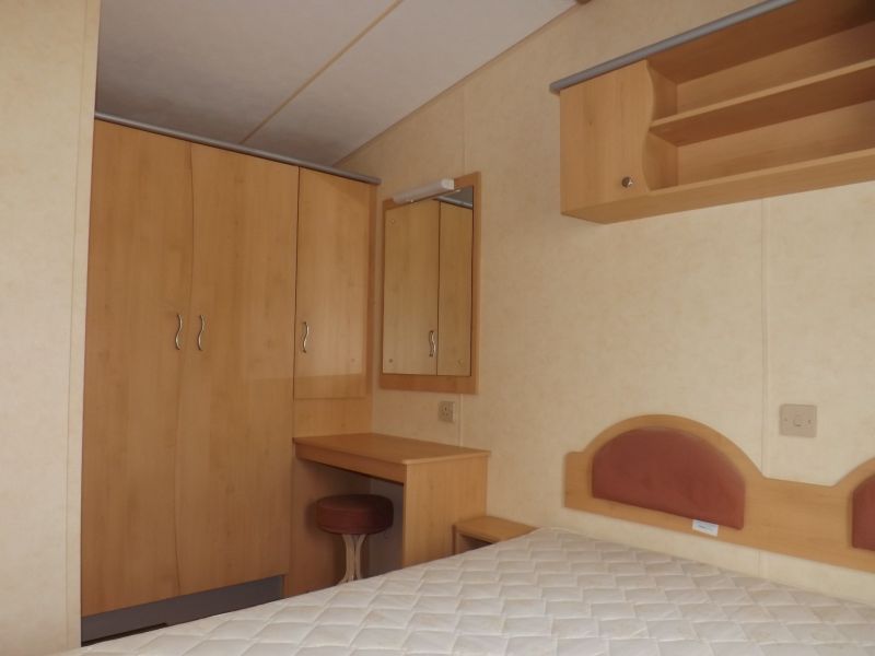 2 bed static caravan holiday home 32ft x 12ft 2006. Home Comforts – Gas Fire. Lounge – Fixed sofa seating, wall mounted tv point, open plan lounge/diner/kitchen, tv unit, pull out bed and coffee table. Dining Area – Fixed dinette. Kitchen – Recirculating kitchen extractor fan, 4 burner hob, under counter fridge freezer, larder unit. Master Bedroom – Double bed, wardrobes, vanity unit/dressing. Twin Bedroom – Standard single beds, single wardrobe. Bathroom – Shower, WC, hand basin. En-Suite – WC and hand basin