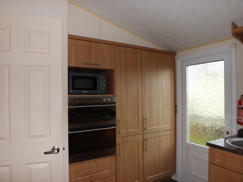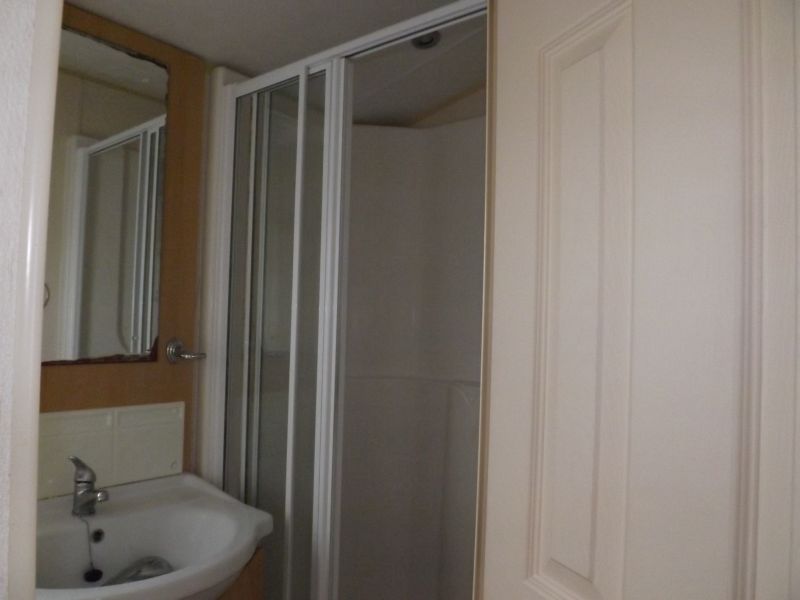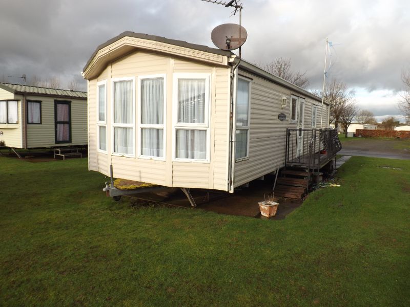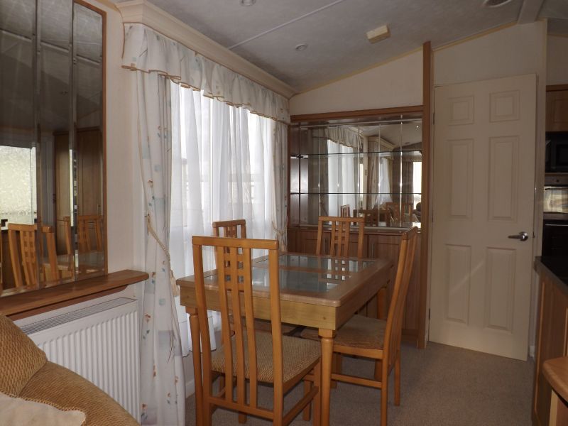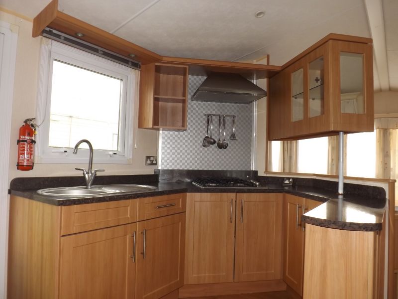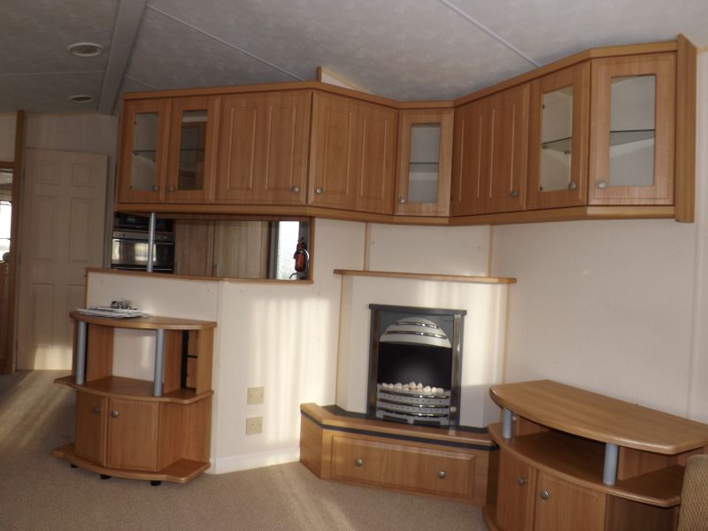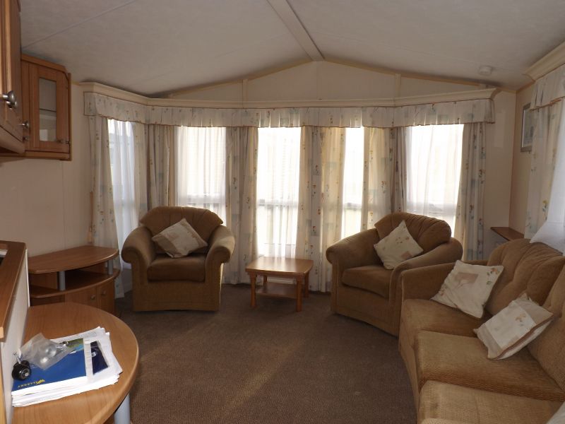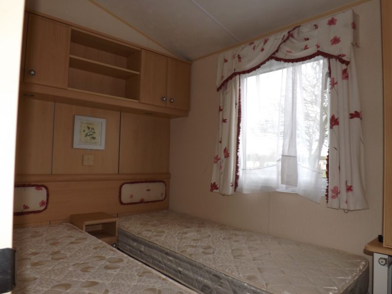 2 bedroom static caravan holiday home 38ft x 12ft 2004. Home Comforts – Double Glazing, Central Heating with Electric Fire. Lounge – Freestanding sofa seating, open plan lounge / diner/kitchen, pull out bed, tv unit, feature bay window and a coffee table. Dining Area – Freestanding dinette. Kitchen – Recirculating kitchen extractor fan, 4 burner hob, integrated 70/30 fridge freezer, larder unit. Master Bedroom – Double bed, walk in wardrobe, vanity unit/dressing table. Twin Bedroom – Standard single beds with single wardrobe. Bathroom – Shower, WC, hand basin.