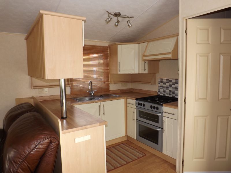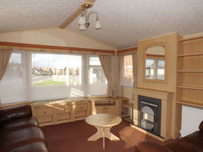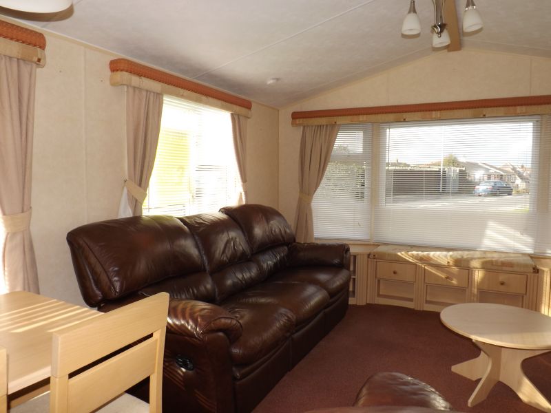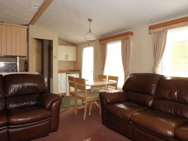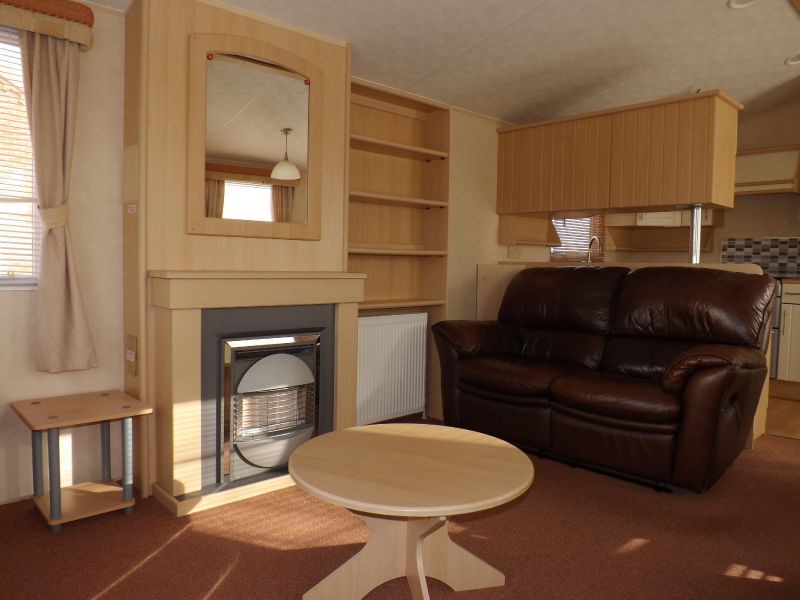 2 bed static caravan holiday home 35ft x 12ft 2008. Home Comforts – Double glazing, central heating with gas fire.. Lounge – Freestanding sofa seating, wall mounted tv point, open plan lounge/diner/kitchen, tv unit and a coffee table. Dining Area – Freestanding dinette. Kitchen – Recirculating kitchen extractor fan, 4 burner hob, under counter fridge freezer, full height storage cupboard. Master Bedroom – Double bed, wardrobes, vanity unit/dressing. Twin Bedroom – Standard single beds, single wardrobe. Bathroom – Shower, WC, hand basin.