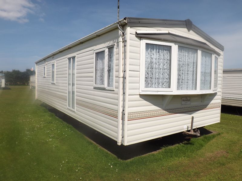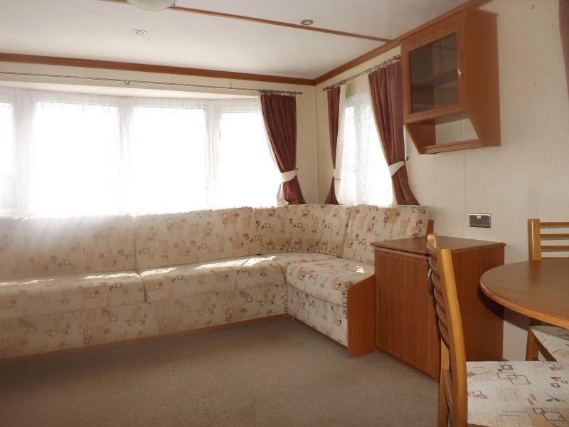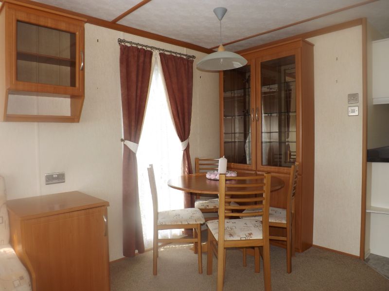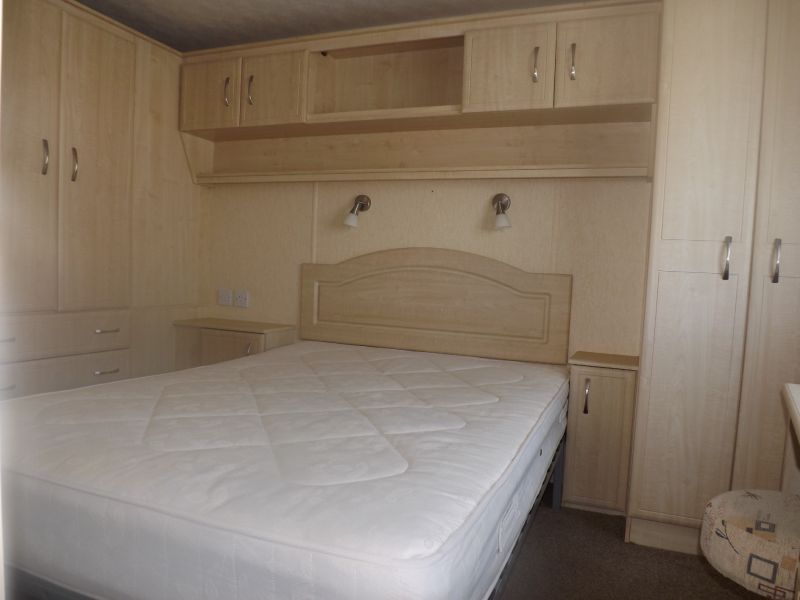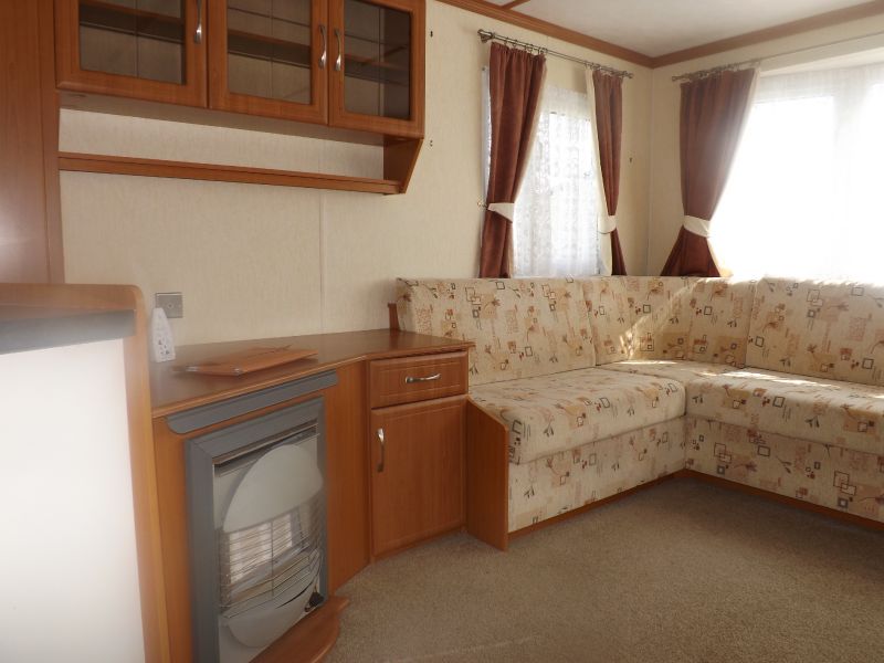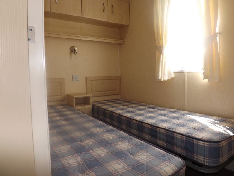 2 bed static caravan holiday home 35ft x 12ft 2006. Home Comforts – Gas Fire. Lounge – Fixed sofa seating, open plan lounge/diner/kitchen, tv unit and coffee table. Dining Area – Freestanding dinette. Kitchen – Externally vented extractor fan, 4 burner hob, integrated 70/30 fridge freezer, larder unit. Master Bedroom – Double bed, wardrobes, vanity unit/dressing. Twin Bedroom – Standard single beds, single wardrobe. Bathroom – Shower, WC, hand basin.
